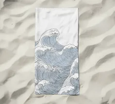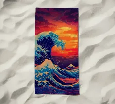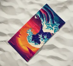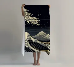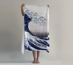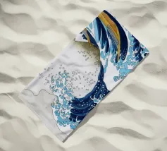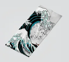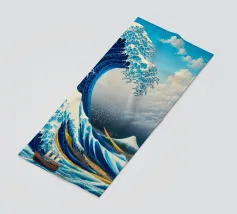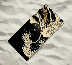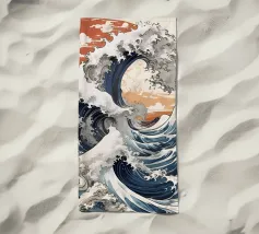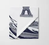 L'immagine raffigura un'illustrazione stilizzata in bianco e nero della Grande Onda al largo di Kanagawa, una famosa xilografia giapponese, con la Torre Eiffel sovrapposta all'onda. L'onda è raffigurata in un movimento dinamico e vorticoso, con creste spumeggianti e una base blu intenso. La Torre Eiffel si erge alta e slanciata, con la sua struttura intricata che contrasta con la forma organica dell'onda.
