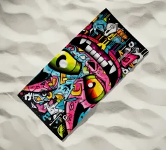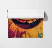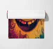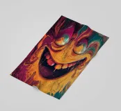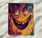 Un ritratto astratto viscerale e ad alta energia, formato da pigmenti fluidi e texture spesse e tattili. Un volto distorto emerge dal colore fuso, con un sorriso esagerato che è al tempo stesso giocoso e inquietante, come se fosse stato colto nel mezzo di una trasformazione. Correnti di vernice si scontrano e gocciolano, creando un senso di movimento, calore e intensità emotiva che appare crudo e immediato.