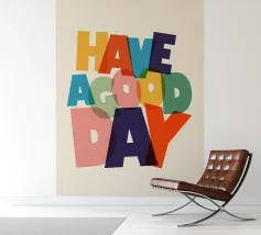 Un design tipografico audace e allegro con la frase edificante "Have a Good Day" in lettere grandi, grosse e colorate con un effetto semi-opaco su uno sfondo color crema. Questa opera d'arte divertente e positiva è pensata per diffondere gioia e rallegrare qualsiasi spazio. Perfetta per pareti colorate, interni allegri e capi d'abbigliamento che regalano sorrisi a tutti. Ideale per chi ama i disegni vivaci e di grande impatto con un tocco giocoso. Progettato da showmemars