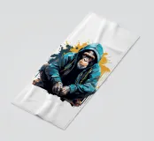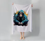 Illustration of a chimpanzee sitting cross-legged while wearing a blue hoodie, surrounded by vibrant paint splashes in orange and blue, combining urban and artistic street art elements.