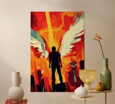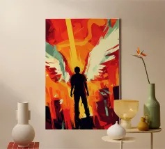 Arte digitale drammatica con potere mitologico: Icaro mostra una silhouette con ali potenti, circondata da un'energia cromatica esplosiva. L'intensa tavolozza - rosso incandescente, giallo brillante, turchese freddo - e l'estetica frammentata ricordano il cyberpunk e la game art contemporanea. I raggi di luce svettanti e le forme frammentate creano una tensione drammatica tra il trionfo e la caduta. Un'interpretazione moderna dell'antico mito: l'arroganza, la trasformazione e il prezzo dell'ascesa. Perfetto per gli amanti dell'arte digitale epica e dei temi mitologici.