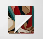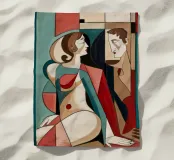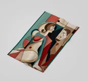 Questo dipinto presenta due figure astratte in una posa intima e ravvicinata. L'uso di forme geometriche e di colori decisi aggiunge profondità e complessità alla scena.