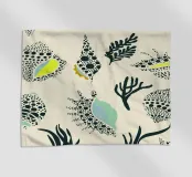 This artistic coastal design features abstract shell, coral, and sea plant shapes arranged in a balanced, modern composition. Delicate dot patterns add texture and depth, while organic silhouettes create a calm, natural rhythm. The soft color palette combines cream, muted green, deep blue, black, and subtle yellow accents for a timeless maritime aesthetic. A stylish, nature-inspired illustration with a contemporary coastal feel, ideal for lovers of minimalist, elegant art with marine motifs.