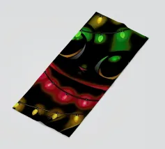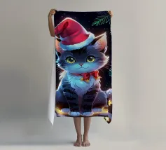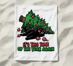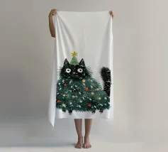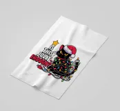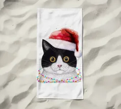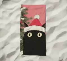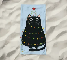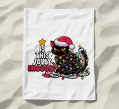 Un gatto nero che indossa un cappello da Babbo Natale è spiritosamente impigliato in luci natalizie colorate. Il testo accanto al gatto recita: "È abbastanza allegro?".