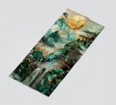 Paesaggio artigianale Kintsugi con un percorso sereno attraverso un cancello Torii dorato, incorniciato da montagne di giada e alberi secolari sotto la luna luminosa.