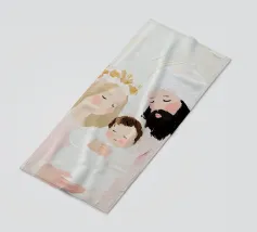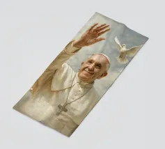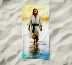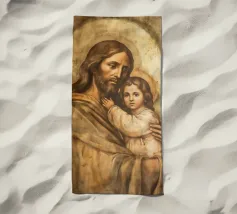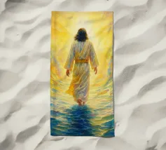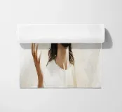 A serene portrayal of a person with long hair and a beard, dressed in a flowing white robe, gazes upward with a peaceful expression. Soft, cloud-like backgrounds enhance the ethereal and spiritual atmosphere.