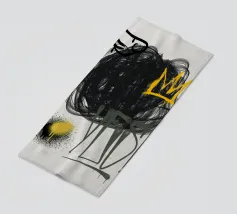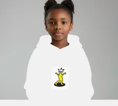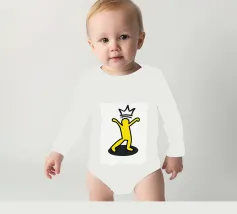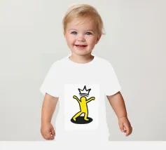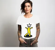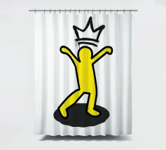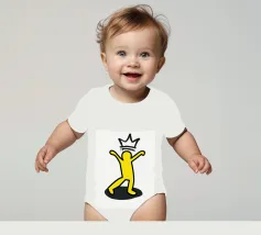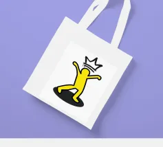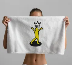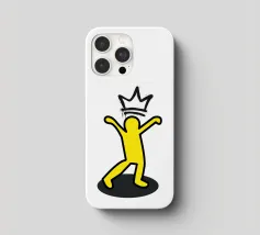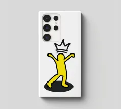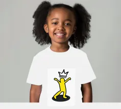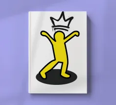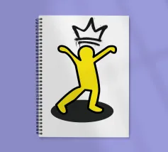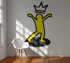 Una figura umana gialla, delineata in nero, lancia gioiosamente le braccia in aria mentre una corona si libra sopra la sua testa. Il design giocoso è caratterizzato da uno stile semplice e audace con un'ombra proiettata al di sotto.