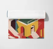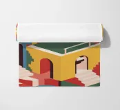 Un complesso e impossibile labirinto architettonico di scale, archi e porte dai colori vivaci.