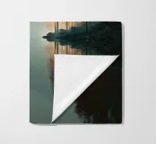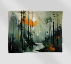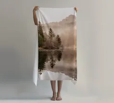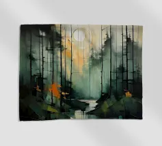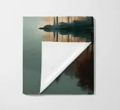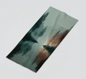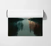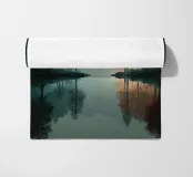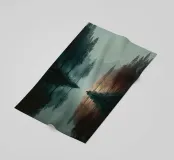 Un paesaggio tranquillo e suggestivo, caratterizzato da una perfetta simmetria e da una quiete ovattata. Uno stretto specchio d'acqua riflette la foresta circostante, creando un riflesso quasi perfetto che sfuma il confine tra terra e cielo. Una fresca nebbiolina ammorbidisce le montagne in lontananza, mentre una luce delicata filtra attraverso gli alberi, introducendo calore e contrasto senza rompere la calma.