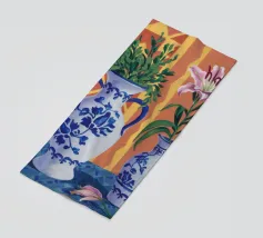 Una natura morta moderna ed eclettica con un paralume a scacchi, un vaso a zig zag e un fiore stilizzato. I motivi e le forme audaci creano una composizione divertente, grafica e di grande stile.