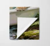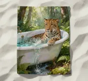 Un mix surreale di eleganza e natura selvaggia: un leopardo a mollo in una vasca da bagno vintage circondata dal verde della foresta.