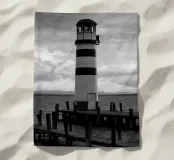 Faro su molo di legno vicino all'oceano
