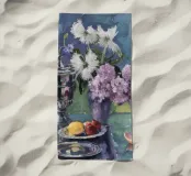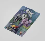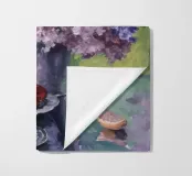 Una natura morta con una brocca d'argento riempita con un rigoglioso bouquet di lillà viola e rosa. Un bicchiere di vino rosso e della frutta si trovano su una superficie scura e lucida che riflette gli oggetti.