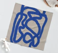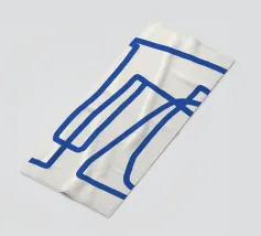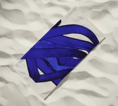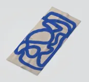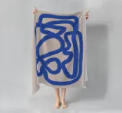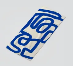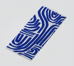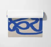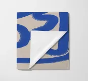 Una spessa linea blu serpeggia su uno sfondo neutro, creando un motivo astratto dalle forme audaci e curvilinee. La semplicità del disegno enfatizza il movimento e il flusso della linea continua.