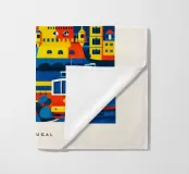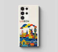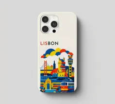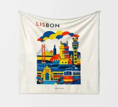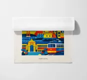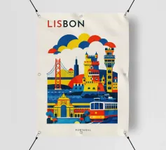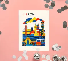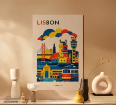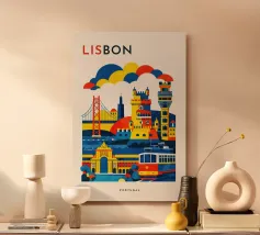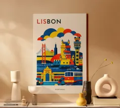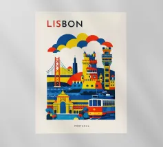A bold, graphic celebration of Lisbon, expressed through clean geometry and vibrant colour blocking. Iconic riverside landmarks and hillside architecture are layered into a lively composition, capturing the city’s rhythm, light, and maritime character. Strong silhouettes and playful contrasts give the artwork energy while keeping the design clear and balanced.