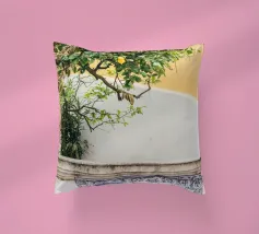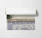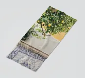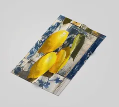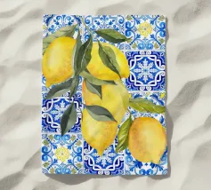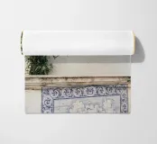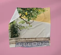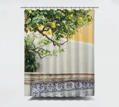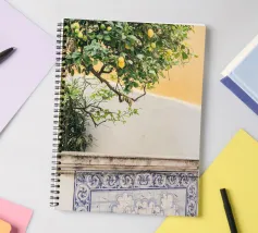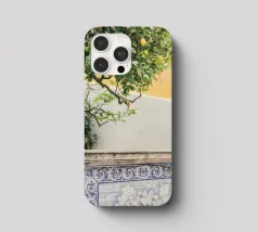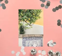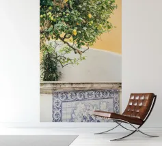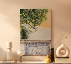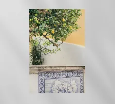Un albero di limoni con le tradizionali piastrelle azulejos bianche e blu a Lisbona, in Portogallo. Una fotografia di viaggio elegante e estiva.