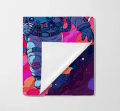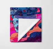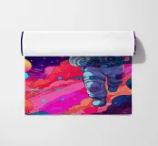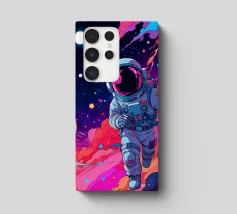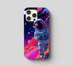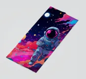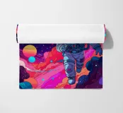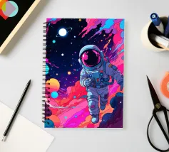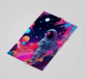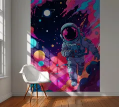 Una rappresentazione vibrante ed energica di un astronauta che sfreccia in un universo caleidoscopico. Nuvole nebulose nei toni del rosa, dell'arancio e del turchese avvolgono lo spazio, mentre pianeti colorati e stelle scintillanti riempiono lo sfondo scuro. La figura dell'astronauta, nella sua dettagliata tuta spaziale, trasmette un senso di movimento e avventura in mezzo alla vastità e alla bellezza del cosmo.
