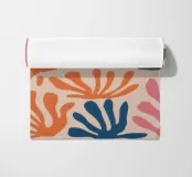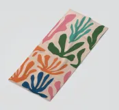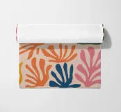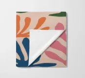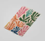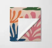 Un motivo di foglie stilizzate nei toni del verde, del rosa e della terracotta, ispirato ai ritagli di Henri Maraoui. La disposizione suggerisce una danza aggraziata di forme botaniche.