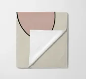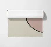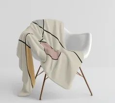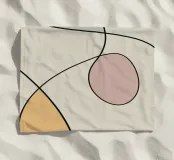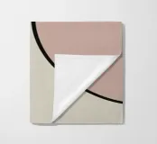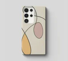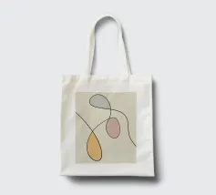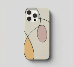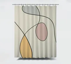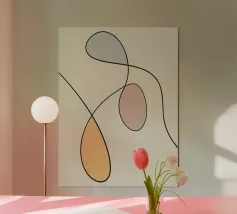 Forme astratte in tonalità tenui sono collegate da linee nere scorrevoli, creando una composizione minimalista. Lo sfondo è di un beige tenue, che esalta la delicatezza dei colori pastello.