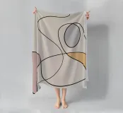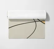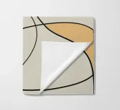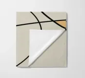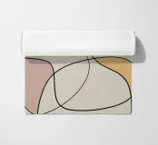 Linee nere curve formano un disegno astratto su uno sfondo beige chiaro, intersecandosi per creare varie forme chiuse. Alcuni spazi sono riempiti da morbide tonalità della terra, come il rosa tenue, il grigio e il giallo.
