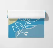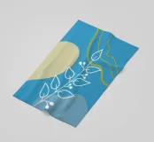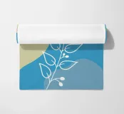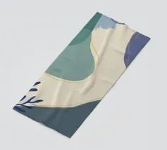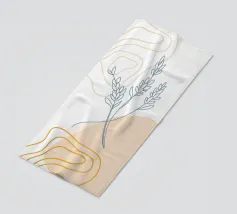 Un disegno botanico minimalista presenta un ramo bianco delineato con foglie. Linee curve e forme organiche nei toni del blu, del verde e del giallo creano uno sfondo moderno e astratto.