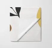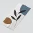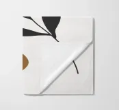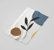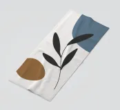 Una composizione minimalista presenta forme astratte nei toni del blu, del marrone e del giallo, abbinate a un semplice elemento botanico nero. Le linee pulite e la palette di colori tenui creano un'estetica moderna e naturale.