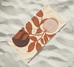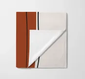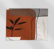 Il design minimalista è caratterizzato da una semplice pianta in vaso con foglie scure, contrapposta a forme astratte e sovrapposte nei toni terrosi del rosso, del grigio e del bianco. Le linee pulite e i blocchi di colore decisi creano un'estetica moderna e rilassante.