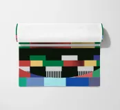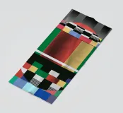 Una composizione di motivi geometrici presenta un cerchio con audaci strisce verticali rosse, gialle e verdi, intersecato da barre orizzontali e circondato da una varietร  di rettangoli a scacchi e a tinta unita. Un mix di colori vivaci e tenui, insieme a linee nette, sono i motivi che caratterizzano la composizione.