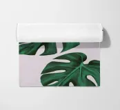 Un'illustrazione ravvicinata incentrata sulle iconiche foglie fenestrate di una pianta di monstera su uno sfondo rosa pallido. La composizione è uno studio semplice, elegante e minimalista di una forma naturale molto amata.