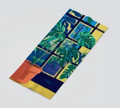 Una vivace natura morta di una pianta di monstera in un vaso giallo, su uno sfondo di motivi astratti e colorati. La composizione è un mix vivace e giocoso di forme naturali e design moderno.