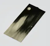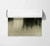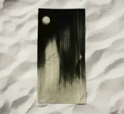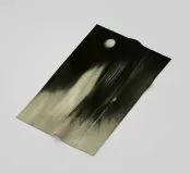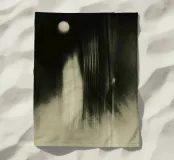 Una scena sfocata e monocromatica evoca un senso di mistero con un elemento circolare luminoso in alto a sinistra, che forse suggerisce una luna. Le striature e le macchie verticali creano un'atmosfera spettrale ed eterea.