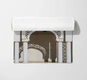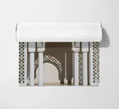 Architettura marocchina. Arco in un edificio in Marocco. Edificio bianco e beige con ombra sul muro. Architettura tradizionale con decorazione.