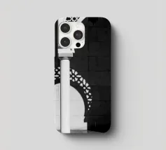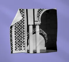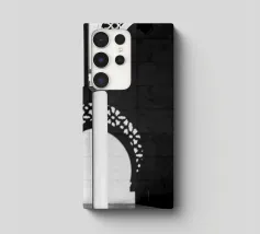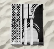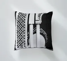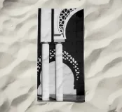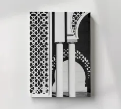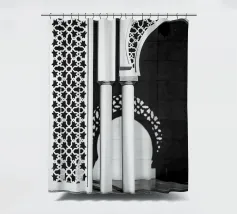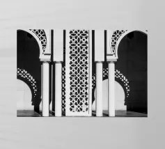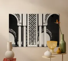 Architettura marocchina in bianco e nero. Archi di una moschea. Ombra sul muro. Decorazione in stile arabo.