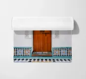 Architettura marocchina a Marrakech. Porta marrone con decorazioni intagliate e piastrelle colorate in nero, verde, arancio e blu.