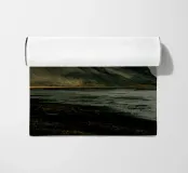 The rugged peaks rise above the mist like ancient guardians, their silhouettes softened by the swirling fog. Wisps of clouds drift lazily across the sky, casting fleeting shadows over the ridges and valleys. In the distance, sunlight pierces through the cloud cover, illuminating parts of the mountain with a golden glow, while the rest remains shrouded in a mysterious, ethereal haze.