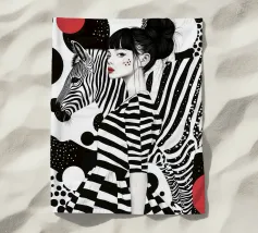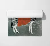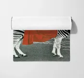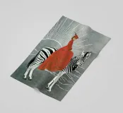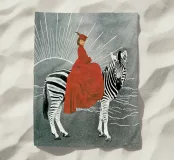 Dipinto vintage di una donna in elegante abito rosso che cavalca la sua zebra verso l'orizzonte al tramonto. Collage a tecnica mista di MsGonzalez