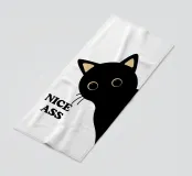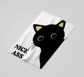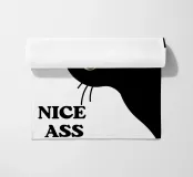 Un gatto nero con gli occhi spalancati sbircia curioso di lato, accompagnato dal testo in grassetto "NICE ASS" nell'angolo. Un design giocoso e umoristico.