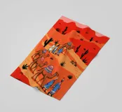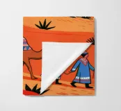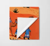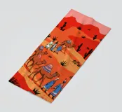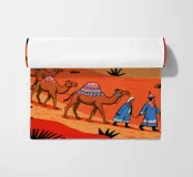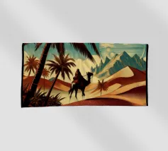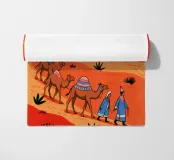 Questo dipinto illustra un gruppo di nomadi con cammelli che attraversano un deserto. La scena è ambientata su uno sfondo di dune rosse e vegetazione rada, che enfatizza l'ambiente aspro ma bellissimo.