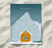 Design minimalista della Norvegia con una piccola capanna gialla sulla costa norvegese delle Isole Lofoten con le montagne sullo sfondo. Tipico cottage scandinavo coperto di neve e paesaggio montano invernale nel nord della Norvegia.