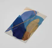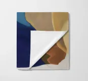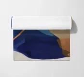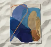 Un'audace composizione astratta caratterizzata da forme forti e sovrapposte nei toni del blu intenso, dell'ocra, dell'arancione e del beige, con linee definite che creano il senso di un linguaggio visivo dinamico e codificato.