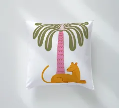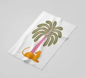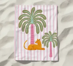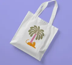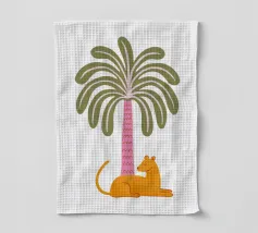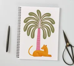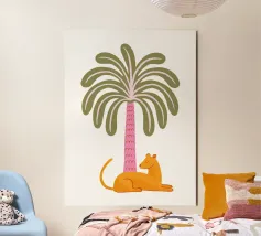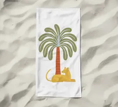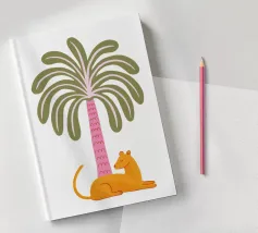 Un disegno giocoso con un grosso felino arancione (leonessa) che riposa sotto una palma.