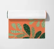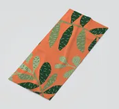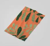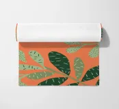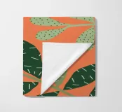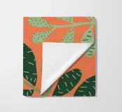 A simple yet striking pattern of various green leaf shapes scattered across a vibrant orange background. The high contrast makes the botanical forms pop, creating a fresh and modern design.