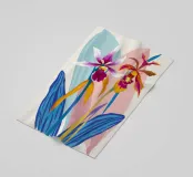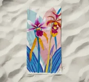 Un'illustrazione splendidamente dettagliata cattura l'eleganza di un'orchidea in fiore, con vibranti petali rosa, bianchi e gialli contrapposti a foglie blu intenso.