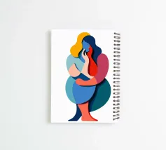 Una composizione astratta stilizzata presenta forme sovrapposte dai colori vivaci, che danno l'impressione di una persona seduta. L'uso audace di blu, rosso, arancione e verde acqua crea un senso dinamico di movimento e forma.