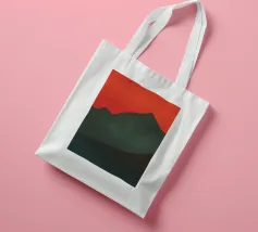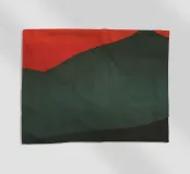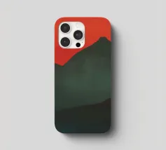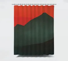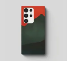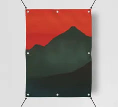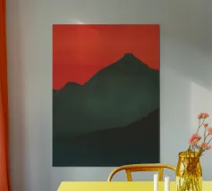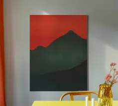 La silhouette di una catena montuosa si staglia su un cielo rosso e arancione, creando un contrasto sorprendente. I toni verdi e neri delle montagne suggeriscono una scena suggestiva al crepuscolo o all'alba.