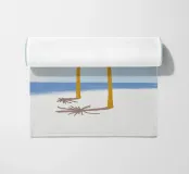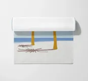 Due palme semplicistiche si stagliano contro un cielo limpido, con ombre che si proiettano a sinistra su una spiaggia di sabbia bianca. Il mare è calmo e appare come una sottile linea blu che separa l'orizzonte dal cielo.