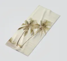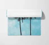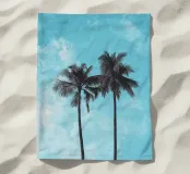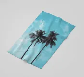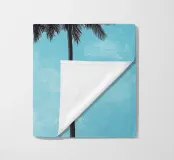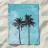 Illustrazione minimalista di due palme contro il cielo, con toni blu tenui e una texture granulosa per un'atmosfera d'altri tempi. Lo sfondo è un cielo blu chiaro con nuvole sottili.