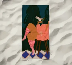 Una donna elegante in pantaloni a righe e un semplice top siede in una posa rilassata, tenendo in mano una tazza rosa. L'opera d'arte cattura un momento informale di chic moderno e senza sforzo e di confortevole solitudine.
