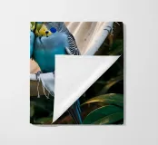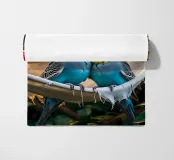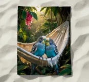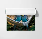 Due pappagallini si accoccolano l'uno all'altro su un'amaca in mezzo al verde. Le loro teste sono leggermente inclinate, come se sussurrassero segretamente che, dopo tutto, questo è davvero il posto migliore del mondo. Perfetto per chiunque voglia portare un po' di allegria e amore nella propria casa. Questa stampa fa parte della serie "Jungle Hammock Tales" - relax estivo con una strizzatina d'occhio. Questa illustrazione digitale è stata creata in stile fotorealistico, con un occhio di riguardo per la luce, i dettagli e l'atmosfera. Visualizzata da Trinkets NL Design Studio utilizzando l'AI.