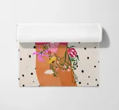 Un'illustrazione stravagante di gambe ornate da calzini rosa a righe e delicati fiori in fiore. Lo sfondo è caratterizzato da giocosi pois neri, che aggiungono un'estetica retrò e moderna. Una fusione di moda e natura, questa opera d'arte emana fascino e creatività.